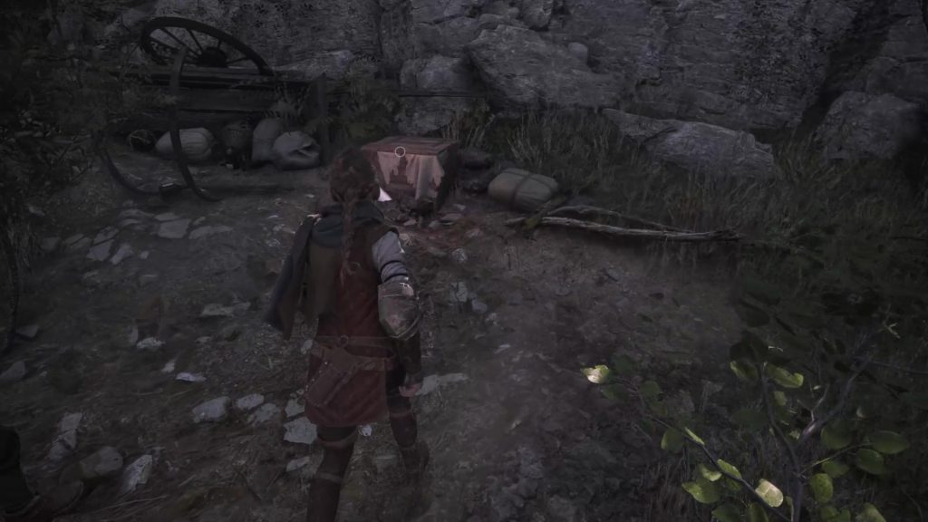 Ve a la derecha y deberías ver un cofre abandonado, que está lleno de los reactivos de alquimia habituales, junto a los restos esqueléticos de un carro. Si pasas por lo que queda del vagón y continúas cuesta arriba, Amicia eventualmente se detendrá cuando escuche lo que Lucas identifica como el bramido de un ciervo.