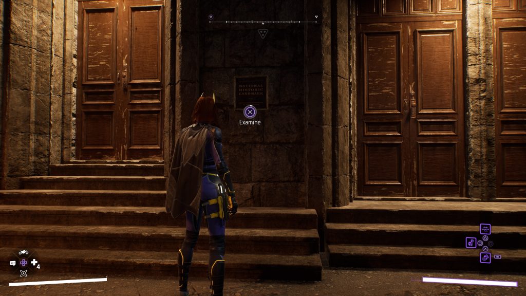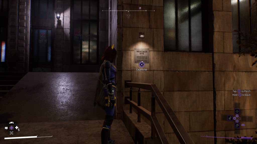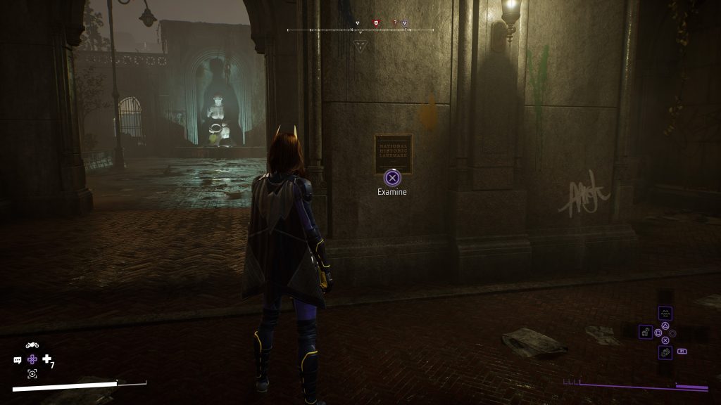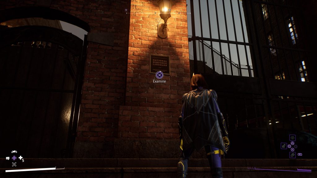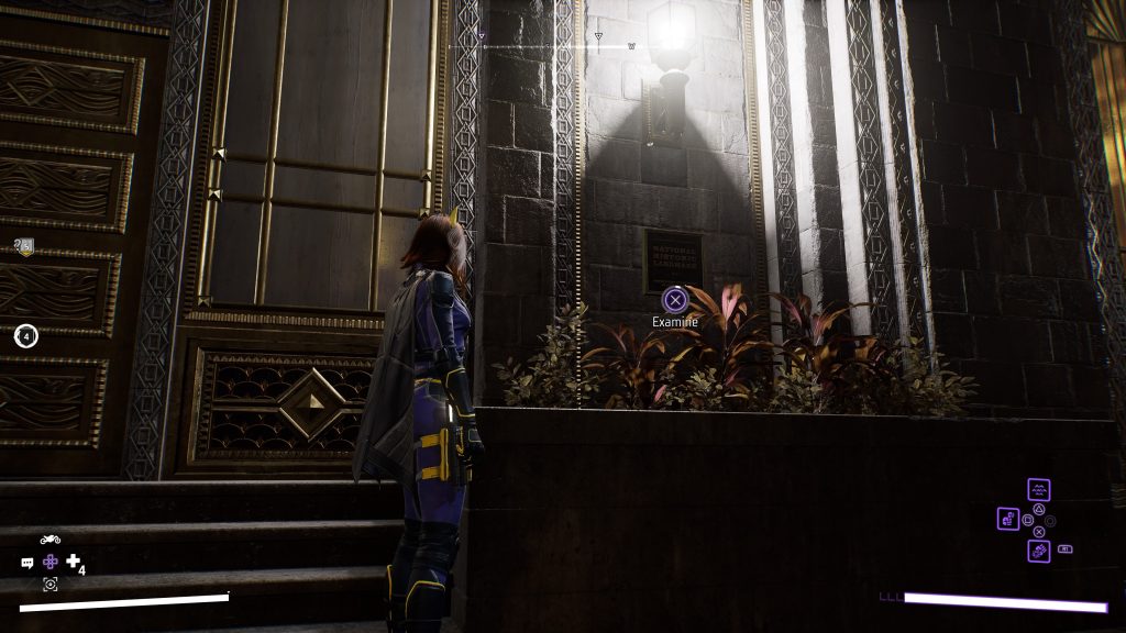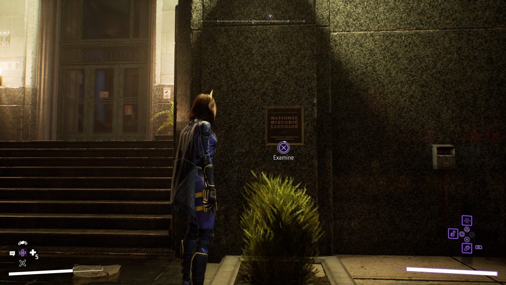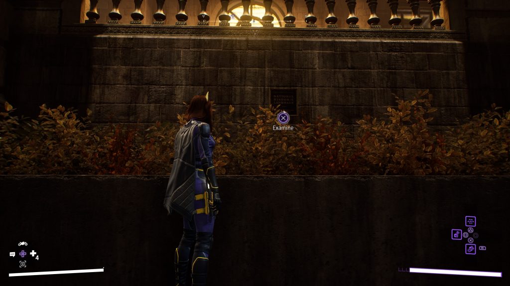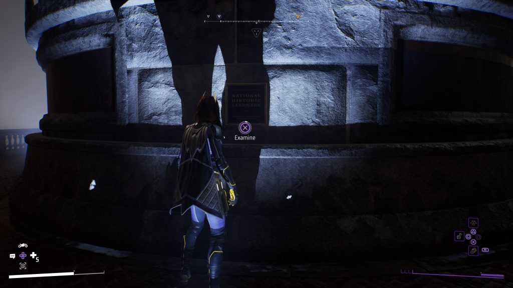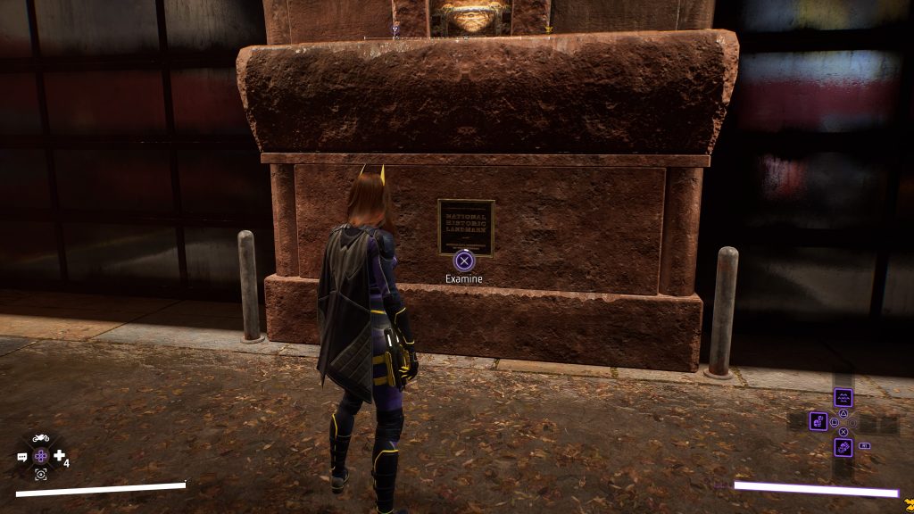 Este punto de referencia está ubicado directamente al norte de la «A» en el texto que dice «Gotham Heights» en el mapa. Interactúe con la placa al costado de las escaleras en el área para registrarlo.