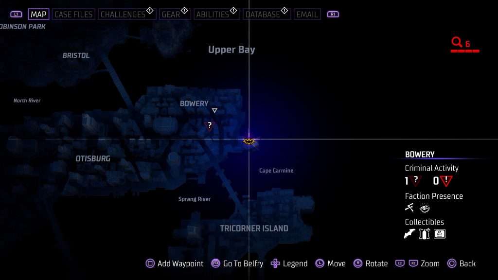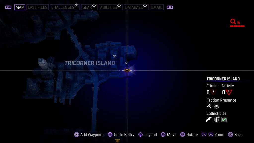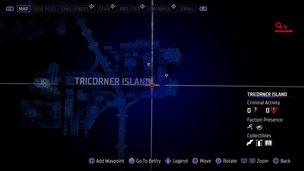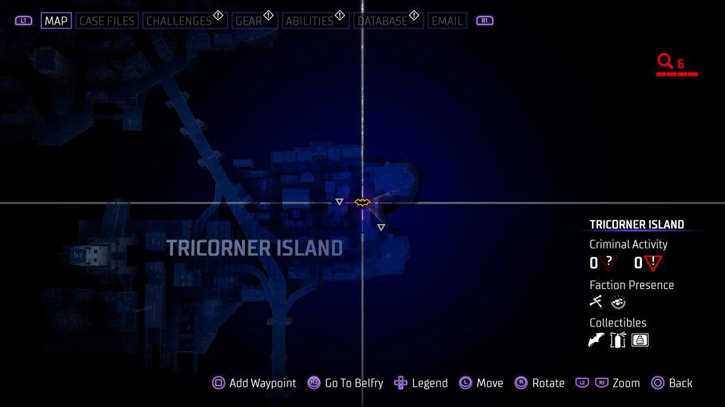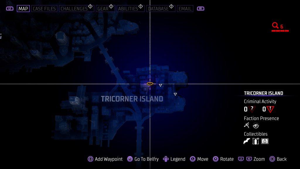 La oficina de correos de Gotham City se puede encontrar fácilmente en la esquina sureste de Tricorner Island, pero la placa se encuentra curiosamente en el lado sur del edificio.
