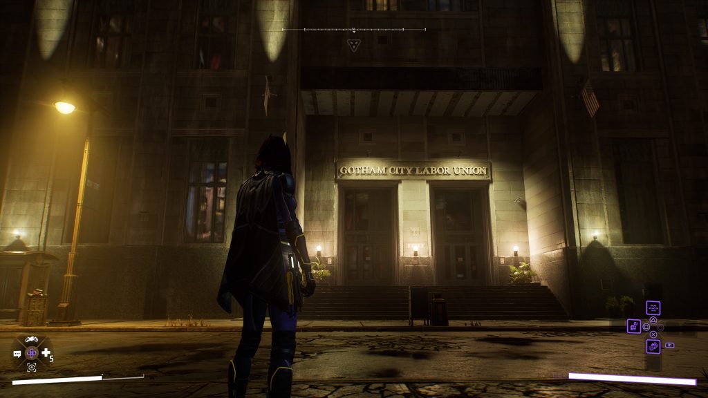 El sindicato de trabajadores de Gotham City se encuentra directamente en la parte superior de la segunda «E» en el texto «West End» que aparece en su mapa. La placa histórica se encuentra a la derecha de las puertas.