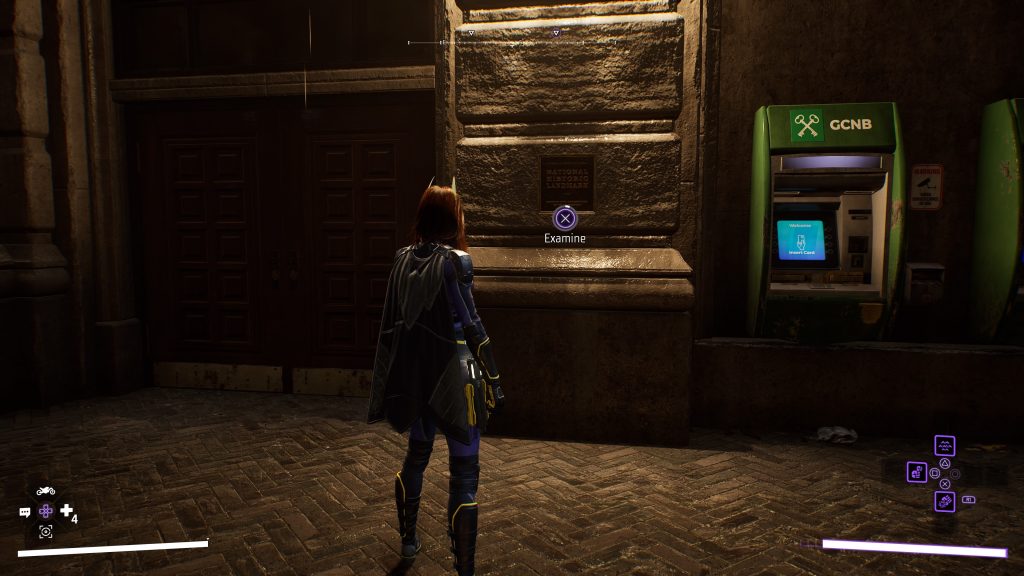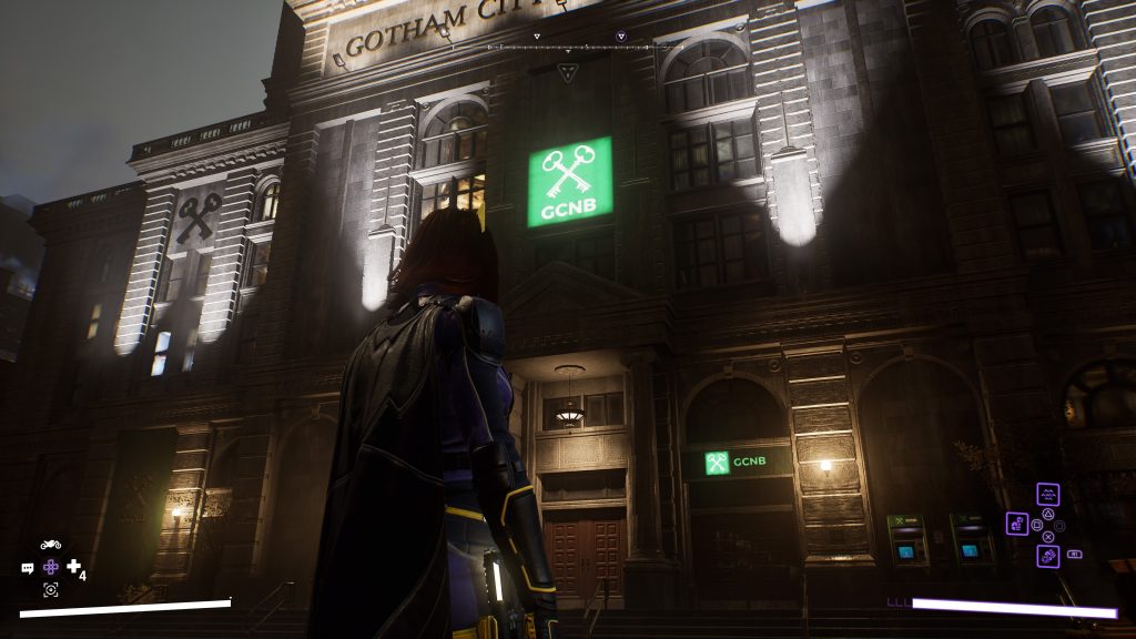 El Banco Nacional de Gotham City es fácilmente identificable gracias a su logotipo verde que está pegado a los lados del edificio. La placa se encuentra en su lado norte.