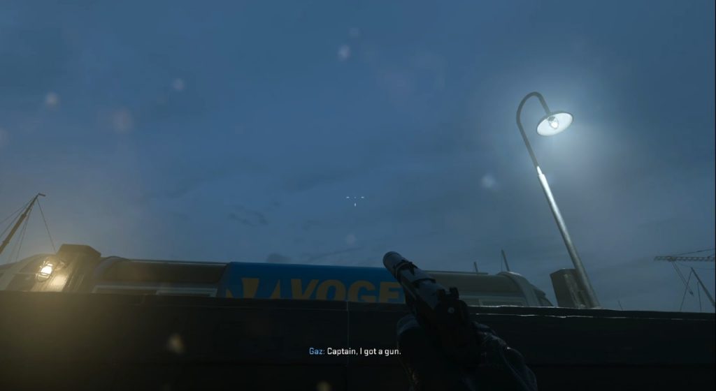 Una vez que tomes el control de Gaz, deberás nadar hasta el muelle directamente frente a ti y matar sigilosamente al guardia que está parado en el muelle. Puedes hacer esto levantándote en el muelle y haciendo un derribo, nadando hasta el borde del muelle y haciendo un derribo de repisa, o sacándolo del alcance con un cuchillo arrojadizo. Independientemente de cómo decidas matarlo, podrás saquear una pistola silenciada de su cuerpo. Esto es lo que usaremos para conseguir nuestras tres muertes con un arma bajo el agua.