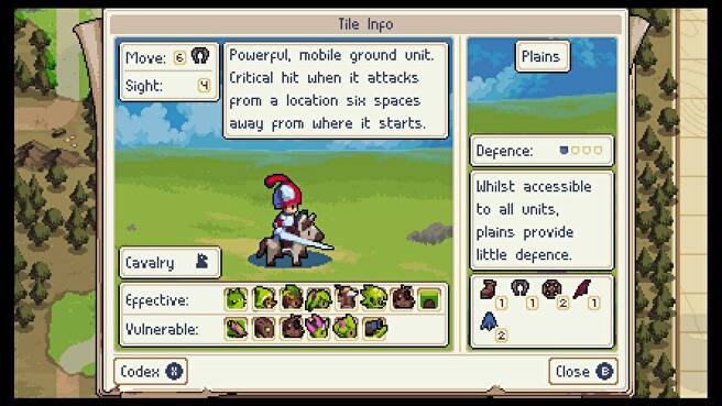 Trazar dónde mover una unidad es clave. Cada vez que vaya a mover una unidad, el cursor se desplazará sobre todos los mosaicos disponibles a los que se puede mover su unidad. Al pasar el cursor sobre un mosaico, podrá ver en la esquina inferior derecha de la pantalla si ese mosaico va a ofrecer protección a esa unidad, o abrirlos y dejarlos vulnerables. Poner una unidad en una montaña, por ejemplo, les dará un gran impulso de defensa, negando el daño entrante, mientras que poner una unidad en un río disminuirá la defensa de una unidad, dejándolos abiertos al ataque.