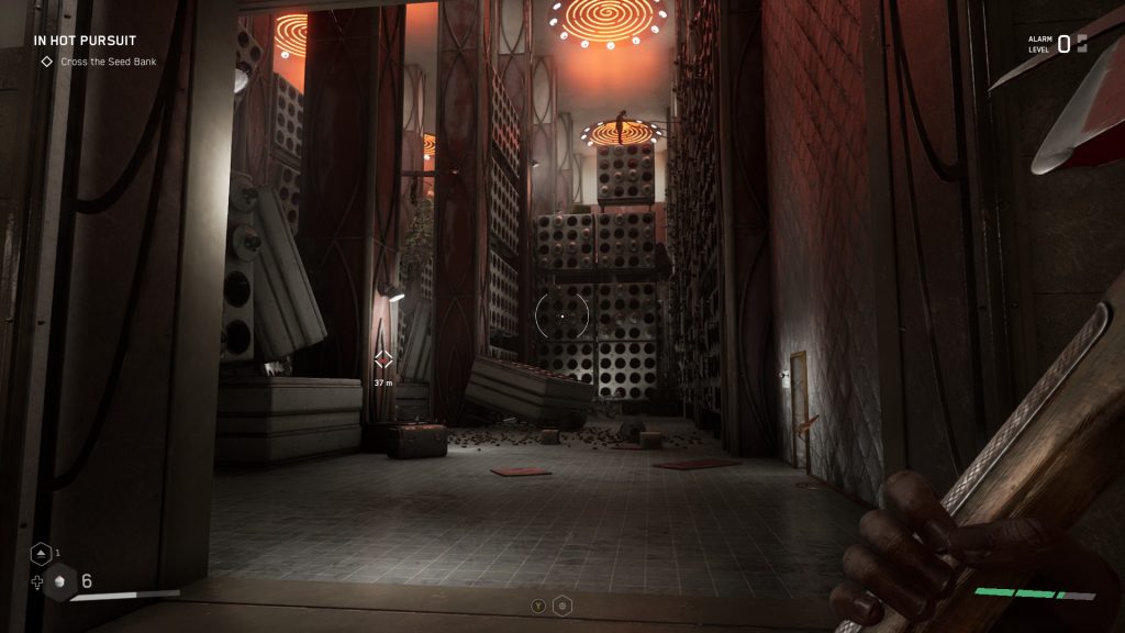 Cómo encontrar Petrov: El Banco de Semillas es una sala muy grande repleta de drones y guardias robóticos. También encontrarás drones de reparación aquí: después de romper cámaras, brillarán en azul. Esto significa que eventualmente se llamará a un dron de reparación para arreglarlo. Destruye las cámaras con tu pistola eléctrica desde el alcance y pasa corriendo.