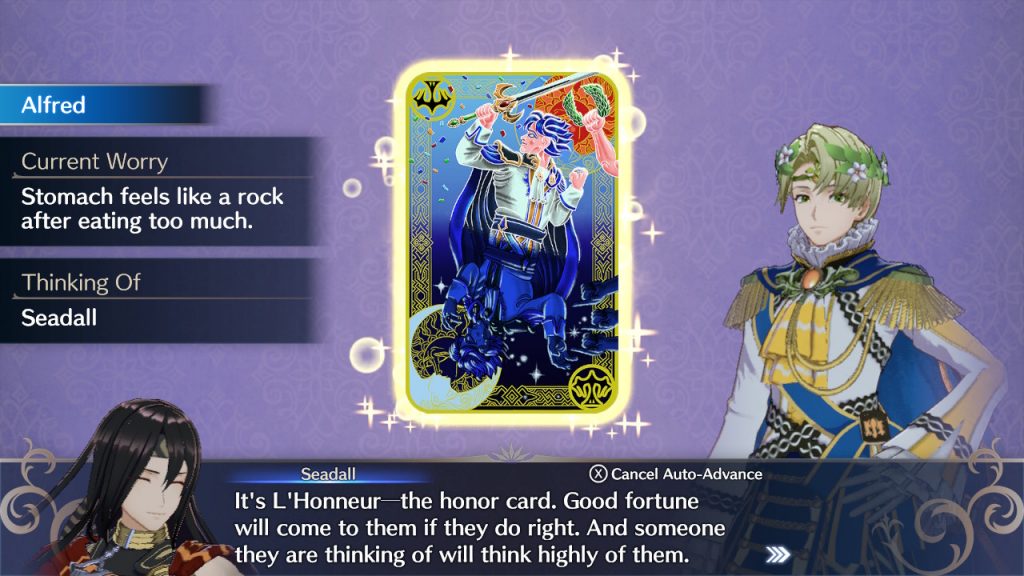 Adivinación en Engage de Fire Emblem es bastante simple, pero también increíblemente aleatorio. Seleccionas un personaje y luego Seadall volteará una carta. La tarjeta no importa, y por lo que sabemos, la emoción que siente la persona tampoco parece importar. Lo único que importa es en quién está pensando ese personaje.