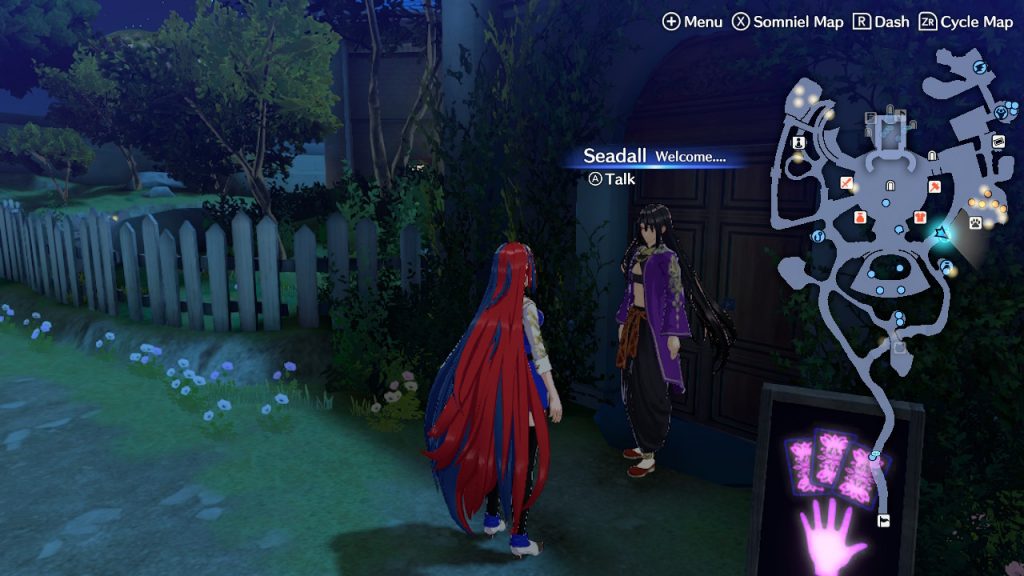 Tenga en cuenta que Seadall solo estará allí por la noche. Para cambiar la hora del día, ve a tu habitación y descansa hasta que sea de noche. Regrese al puesto y Seadall debería estar listo para voltear algunas cartas del tarot.