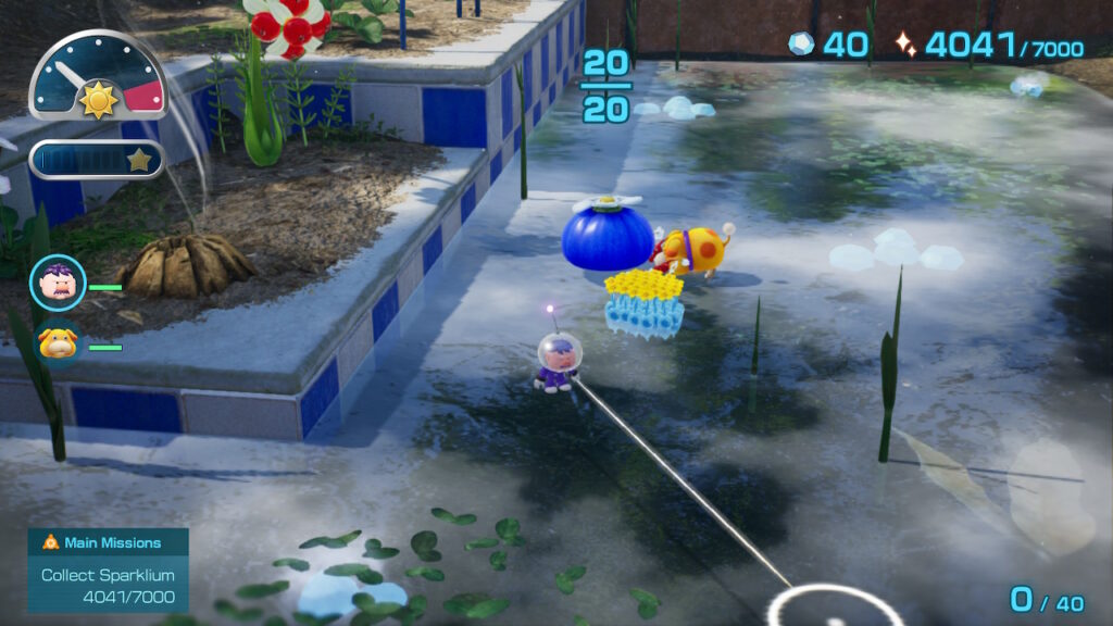 Una vez construido, sube la pared y derrota a los enemigos. Verás la cebolla azul en el suelo. Descárgalo y tropieza con tu primer obstáculo: requiere 20 Pikmin y solo tienes 10. Oatchi actualmente no puede ayudar debido a su incapacidad para escalar la pared.