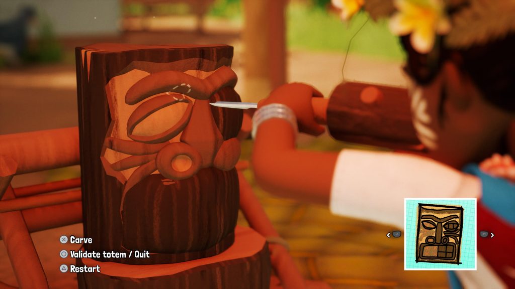 Siéntate y talla el tótem para que coincida con el del mapa. Una vez que lo hayas terminado, pon el tótem en tu mochila y luego dirígete a la puerta del santuario del tótem.